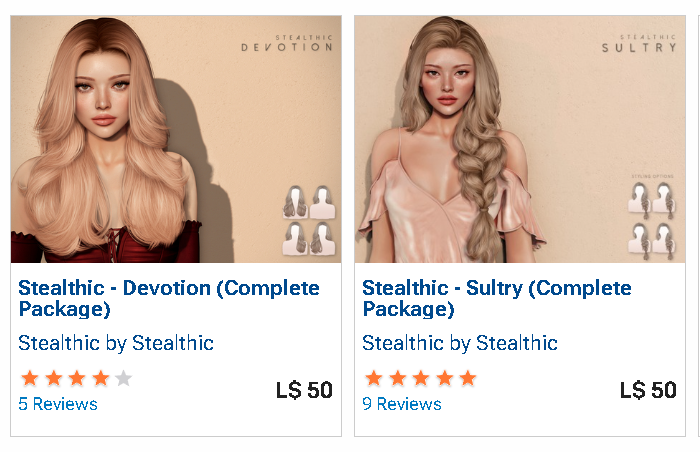 https://marketplace.secondlife.com/p/Stealthic-Devotion-Complete-Package/22402559Stealthic has 2 hairs at 50 Lindens on MP for a limited time. https://marketplace.secondlife.com/p/Stealthic-Sultry-Complete-Package/18577727 https://marketplace.secondlife.com/p/Stealthic-Devotion-Complete-Package/22402559· 0 Comments ·0 Shares ·502 Views1