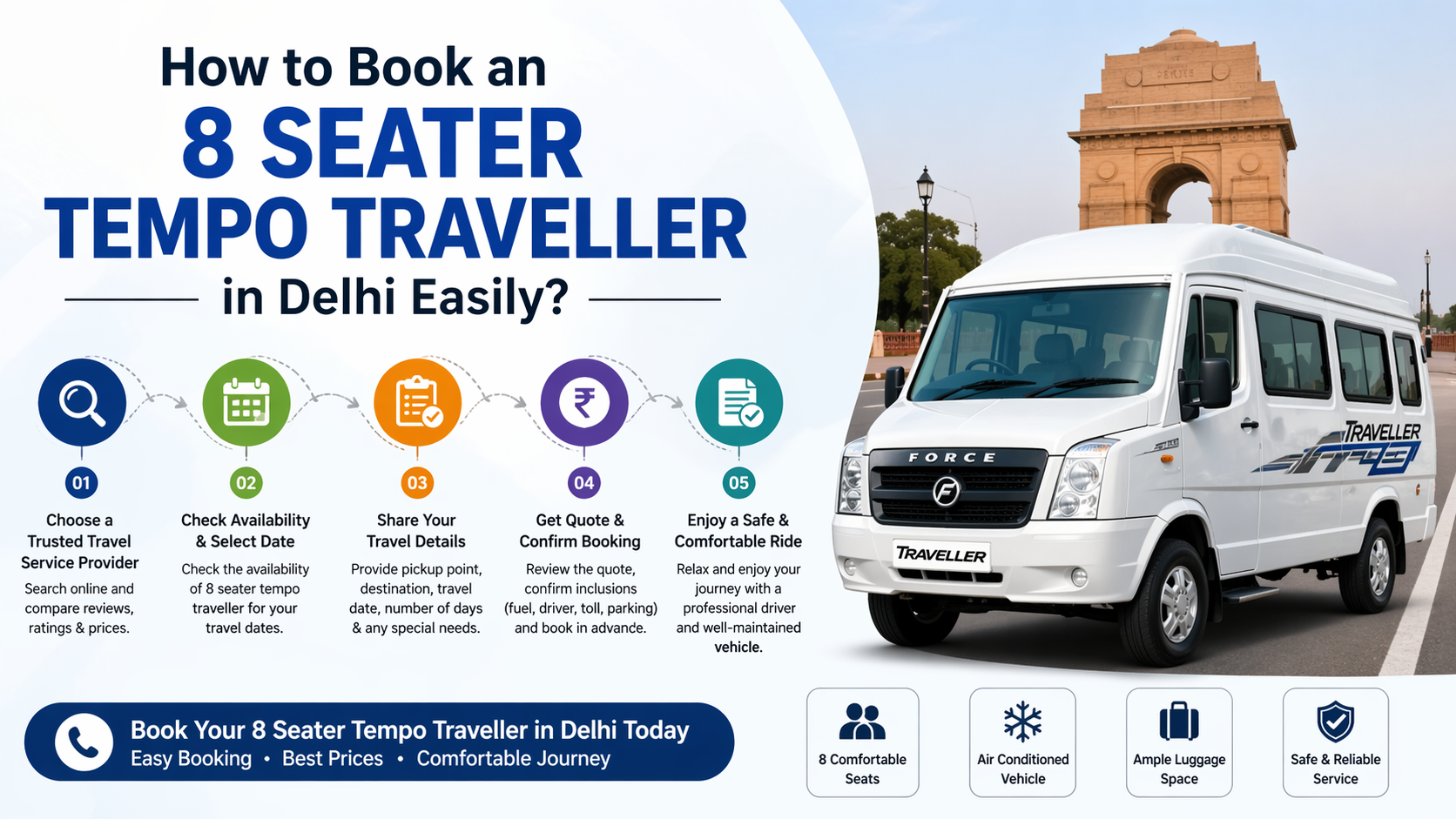 Booking an 8 Seater Tempo Traveller in Delhi is simple if you follow the right steps. Whether you're planning a family trip, weekend getaway, or a short group tour, this vehicle offers the perfect balance of comfort and convenience.